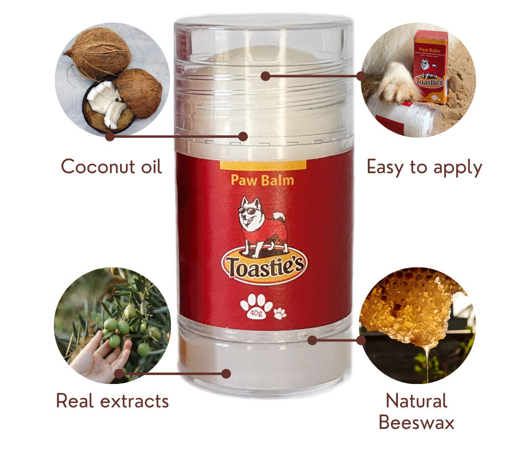 Made with natural plant oils, vitamin E and natural beeswax, Toastie's Paw Balm is lick-safe, no nasties!